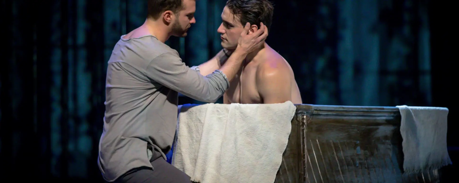 Edmonton Opera’s male chorus, playing the complicit inmates, gave a fine performance on a simple set by Guillaume Lord consisting of floor-to-fly prison bars that contained and symbolised the drama nicely. One especially effective scene, filled with real operatic tension, saw the men rhythmically slapping their belts on the stage floor to depict the Simon’s beating at the hand of his father, Timothée (bass Claude Genier), when he learns Simon has kissed a man.