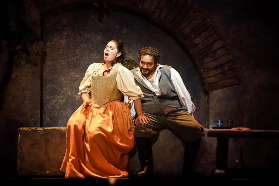 The production is perfectly mundane, all quaint courtyards, velvet drapes and Renaissance-era costumes. Visually, Anne-Catherine Simard-Desraspe’s lighting design was the most interesting thing about it, giving every scene the rich, velvety depth of a Holbein painting. Within this pretty frame, Cavanagh offered a shockingly banal, offhanded approach to the opera’s intrinsic misogyny.