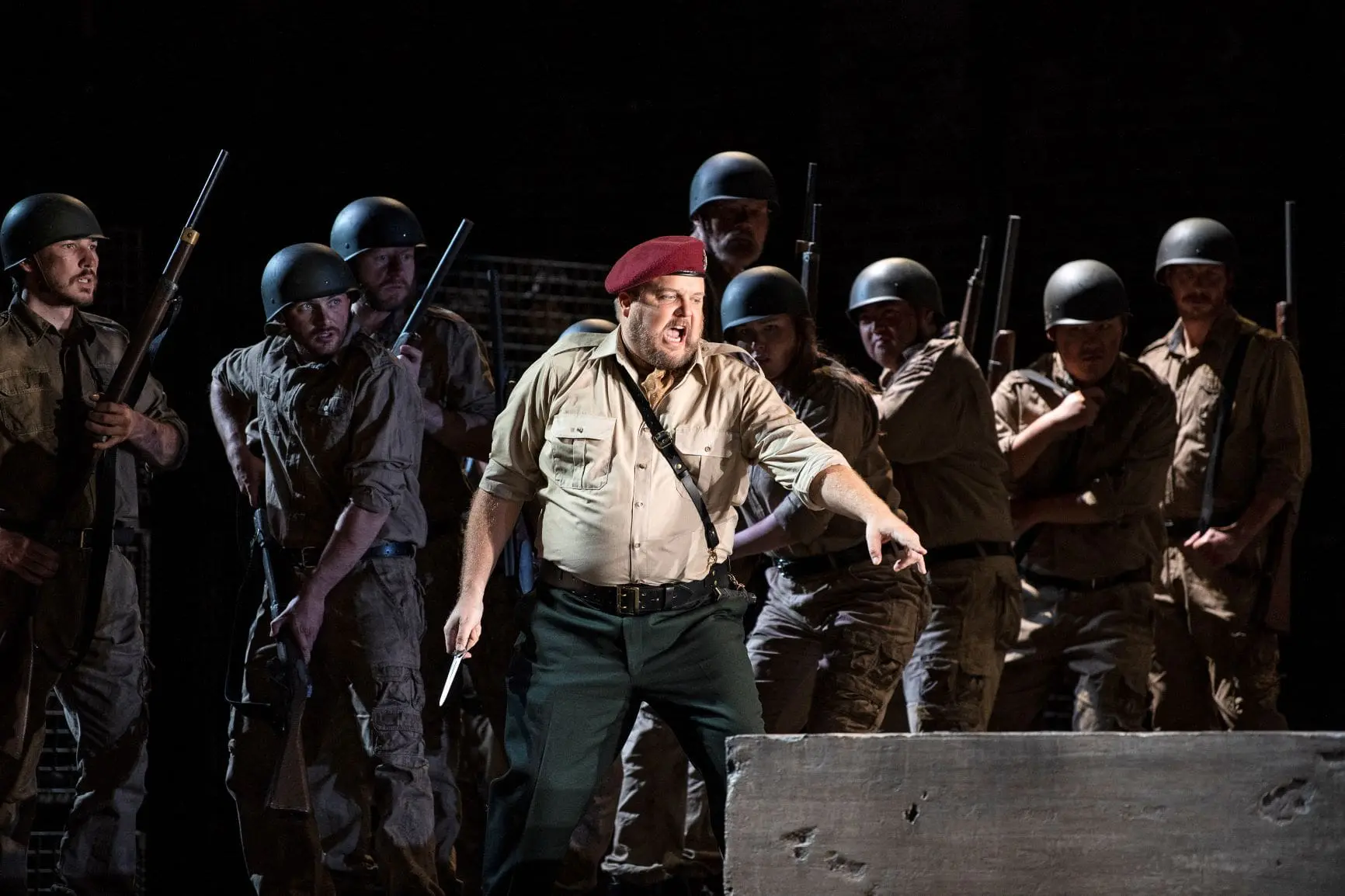 During the overture and behind a scrim, the principal singers mimed Pizarro’s arrest of Florestan and Leonore’s subsequent absorption into a network of dissidents, including Marzelline and Jaquino, ready to assist in her quest to free her husband from oppression. They help disguise her as Fidelio, and as the scrim goes up, she becomes a silent participant in a game to trick Rocco into believing his daughter has really fallen in love with Fidelio. Not only did this complicated setup completely overshadow the overture, but the high drama of soldiers invading a home and dissidents raising their closed fists made the transition to the jolly first scene—which takes place, we gradually find out, two years after Florestan’s arrest—quite jolting.