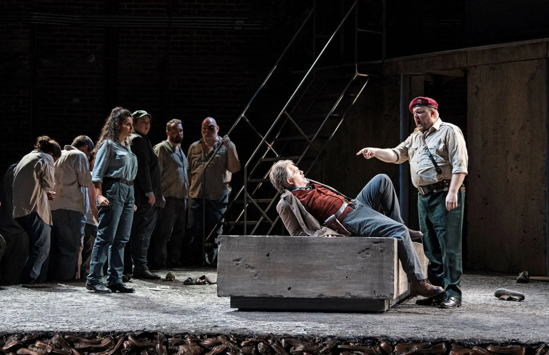 And the jolts continued, beginning with the startling thump of perhaps 20 pairs of old shoes dropped onto the stage from on high, just in case we missed the symbolism of the hundreds of shoes already embedded on the stage floor, contained in baskets, and buried under the dungeon in which Florestan is kept. This kind of obviousness—echoing shoes left behind by Jews murdered at Auschwitz—was also evident in the busy stream of video projections by Monica Hernandez, driving home the themes of war, brutality, and imprisonment.