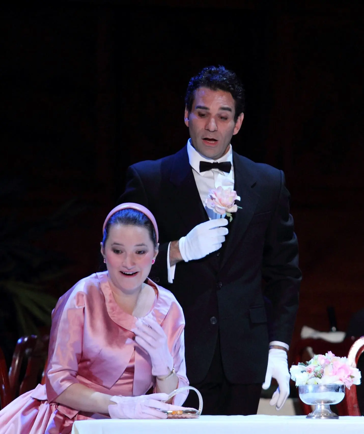 In the second scene, we find the Merry Wives lunching in the dining room of the Garter Inn. Their chic 1950s outfits are just a taste of the vast panoply of satins, flowered prints, handbags, pumps, hats and wonderfully imaginative costumes that the designer Brigitte Reiffenstuel has in store for us. The wasp-waisted corsets and flared skirts are particularly suitable to the elegant Anna María Martínez who is an impeccable Alice Ford. Antoun and Prohaska form an impetuously lovable couple and win us over with their effortless voices and style. In this staging, Fenton is a waiter working at the inn’s dining room. Smartly dressed in tux and white gloves, his ploys are touching as he tries to woo his sweetheart away from the group of chattering matrons.