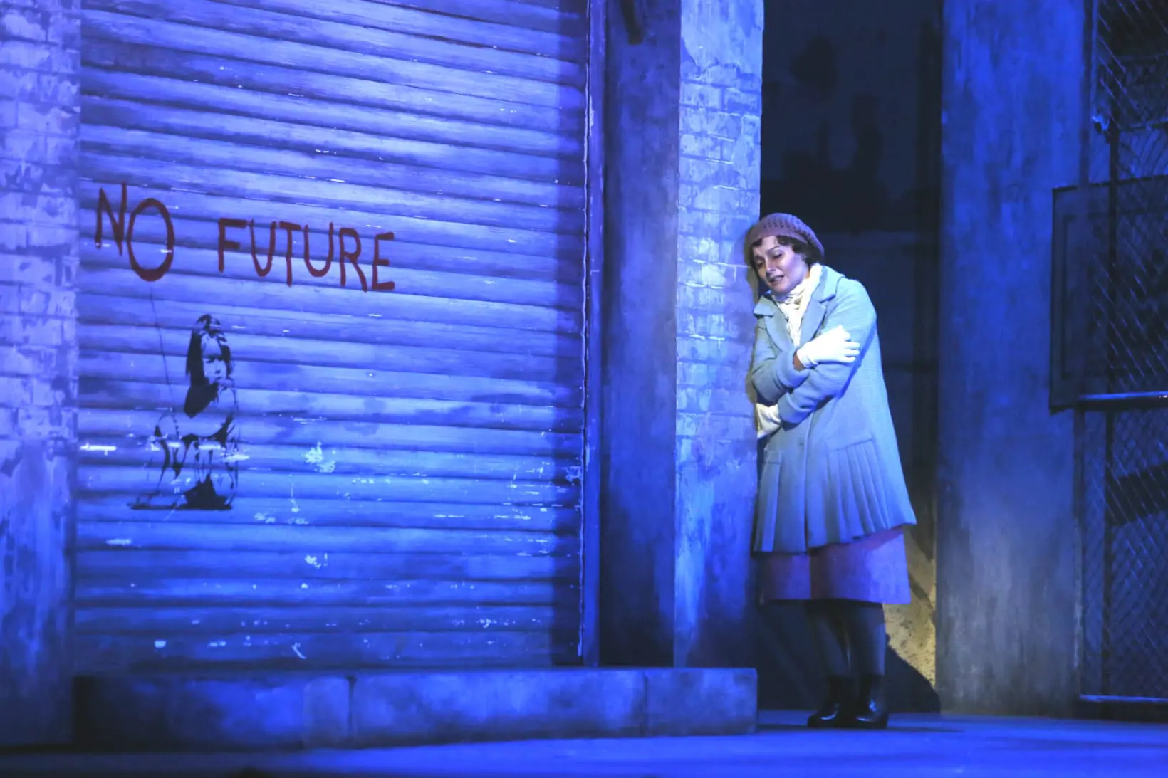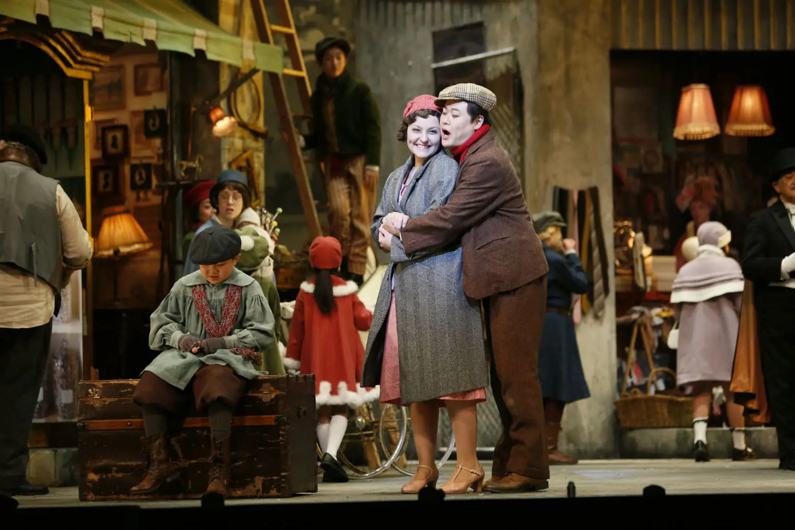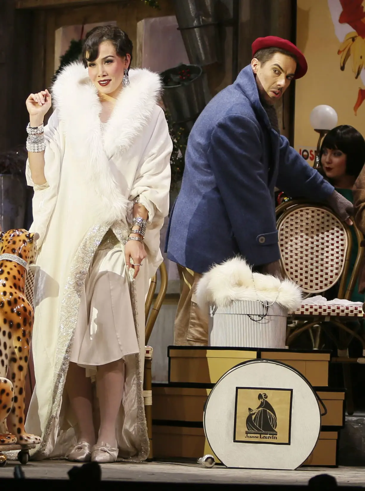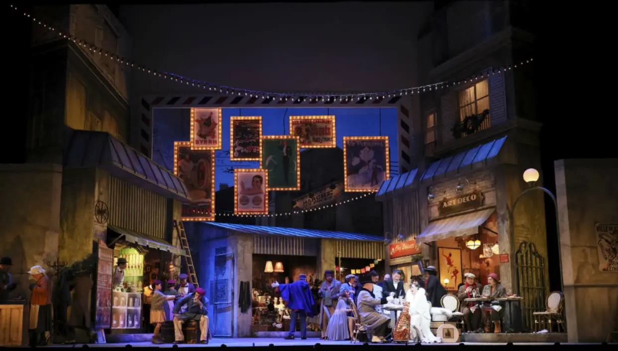 And that’s where this production begins: in a bustling contemporary Parisian flea market, complete with antique shops, tourists, street vendors, pickpockets, an accordion busker and children running amok. An ailing woman, fascinated with an old phonograph in a shop display, puts on a record and the music transports her back to 1920s Paris where she imagines herself as Mimì in Puccini’s opera …