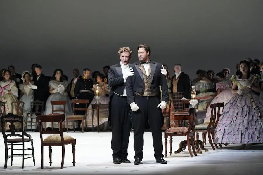Canadian Robert Carsen’s staging of Eugene Onegin, in settings and costumes by Canadian Michael Levine, with lusciously expressive lighting by Christine Binder, started at the Metropolitan Opera some 25 years ago. Few opera productions live as long and travel as widely as this one has. Light on scenery (just a crisp-cornered cyclorama), rich in lovely costumes, and heavy on chairs, it must be light on transport.