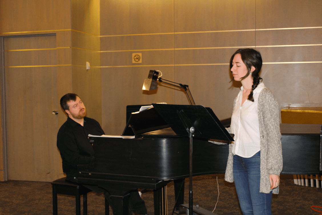 Michael Shannon & Sara Shabas at Beth Tzedec Congregation rehearsing for The Electric Bond Opera Ensemble’s, Another Sunrise and Farewell, Auschwitz. Photo: Sahar Khan
