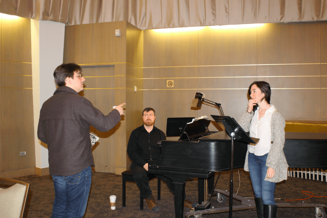 Aaron Willis, Michael Shannon, & Sara Schabas at Beth Tzedec Congregation rehearsing for The Electric Bond Opera Ensemble’s, Another Sunrise and Farewell, Auschwitz. Photo: Sahar Khan