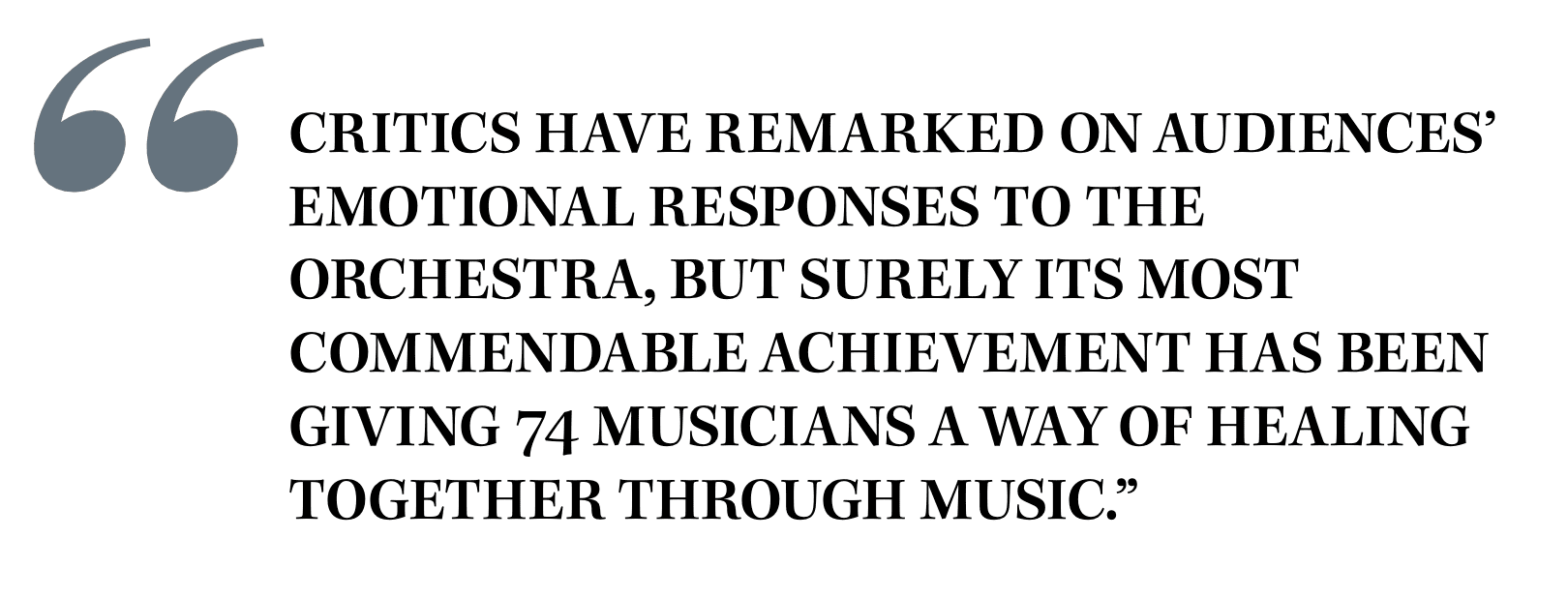 The “tour was the mission,” as she puts it, with an echo of military language, but the response from audiences was so strong and the quality of the orchestra was so “surprisingly good, there was no way we could call an end to it.” Surprising, I think, in the sense that many of the musicians had not played together before, recently fled their country, and lived with constant fear and anxiety, in conditions of great uncertainty. Critics have remarked on audiences’ emotional responses to the orchestra, but surely its most commendable achievement has been giving 74 musicians a way of healing together through music.