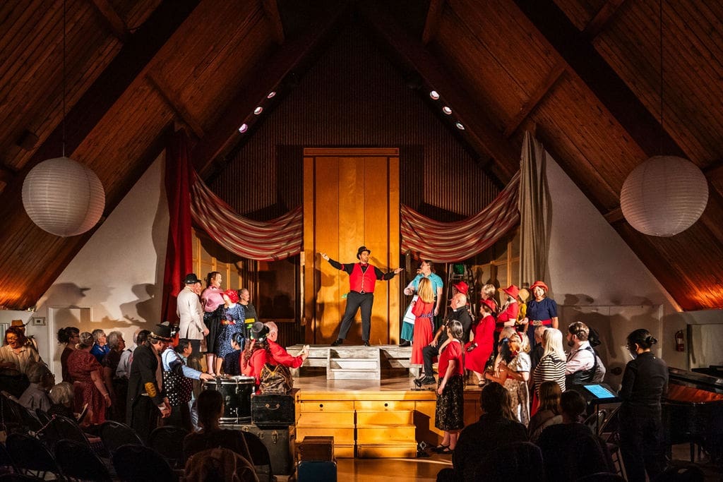 I am filled with admiration for the work done by the community chorus. There were some rough patches in the fast-paced opening chorus, but the enthusiasm of this volunteer-based group was infectious. When they were spread out throughout the venue, they maintained their pitch and, for the most part, remained in sync. Every chorus member was invested in their characters, which made for an exhilarating evening.