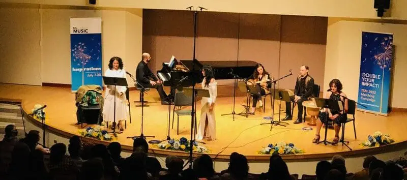 Afarin Mansouri’s new Farsi language opera Zuleykha was workshopped last night at Walter Hall as part of the Toronto Summer Music Festival. I knew the piece would be presented concert style but I confess I wasn’t expecting a workshop or for the work to be presented in quite as incomplete a form as it was. We got excerpts from the first act linked with an English language narration, a brief summary of the second act and the instrumental part of the second act finale (intended as a chorale eventually). The instrumental ensemble was piano, tar and percussion and the instrumentalists also stood in for the chorus.