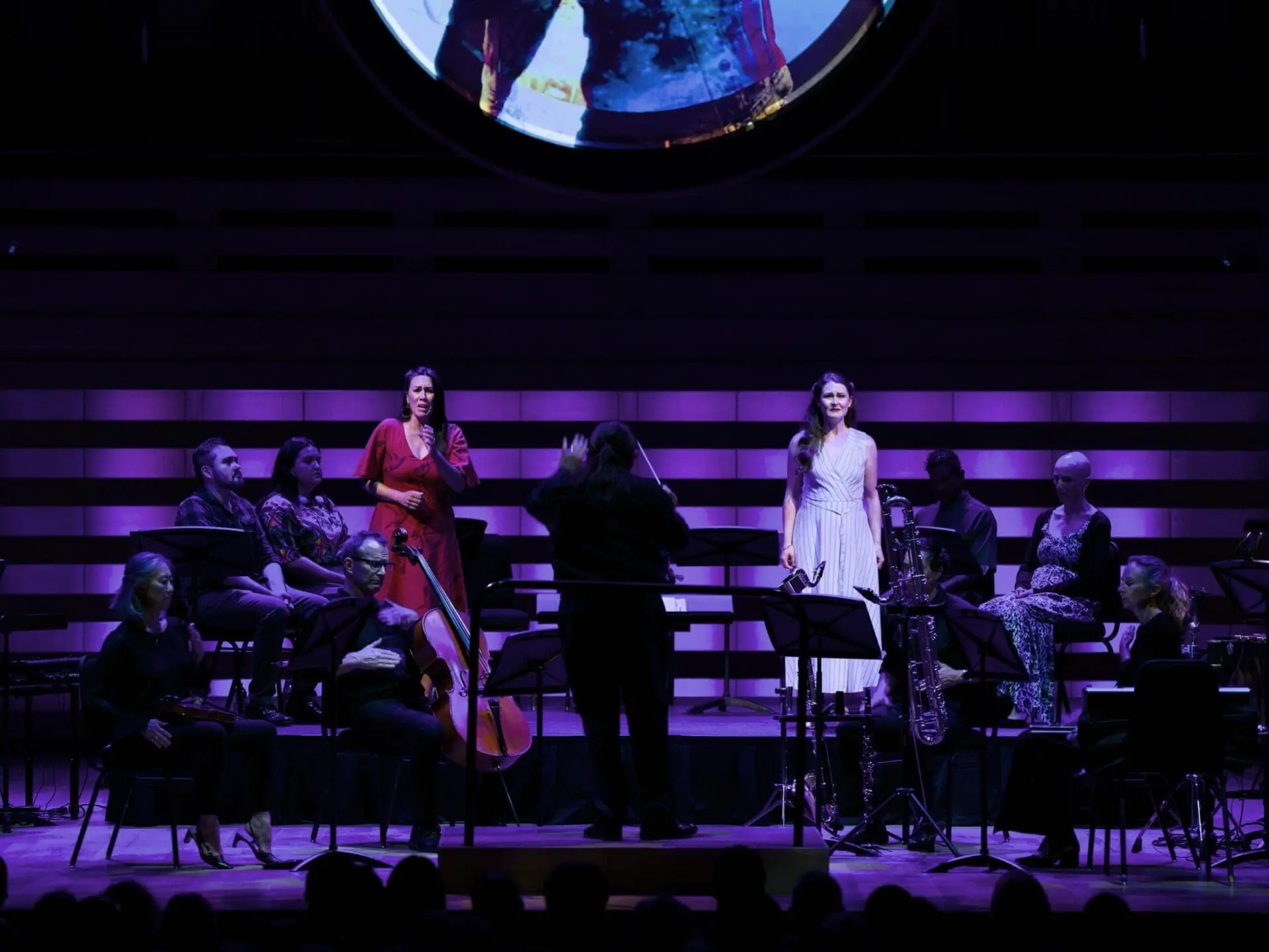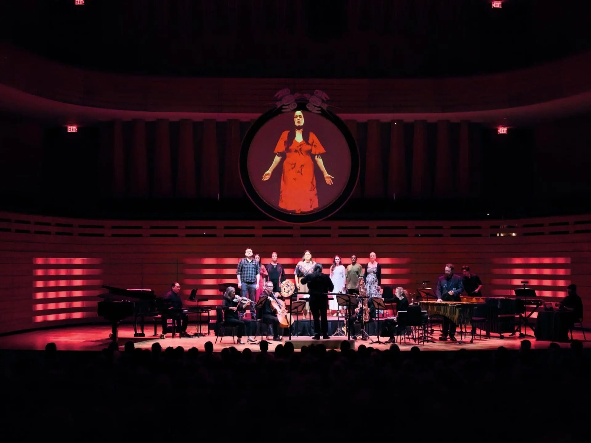 There was no weak link in the cast of seven. Kudos to the two main characters, Caitlin Wood (Ava) and Melody Courage (Native Girl) – two singers with similar timbres, a happy coincidence! Marion Newman (Dr. Wilson) dominated the stage in her moments in the spotlight. Also impressive were Andrea Ludwig as Jess and Asitha Tennekoon as Devon. The placement of the singers behind the orchestra was more problematic, making them hard to see from where I was sitting. Unfortunately, the conductor blocked a couple of the singers from time to time.