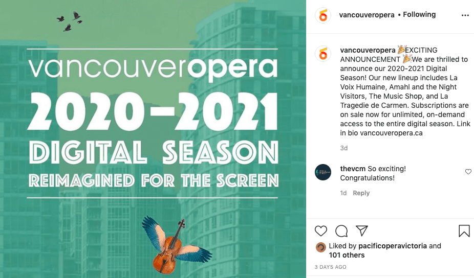 Vancouver Opera has postponed original plans for its 60th anniversary season to 21/22 but plans to present an alternative 20/21 season online.