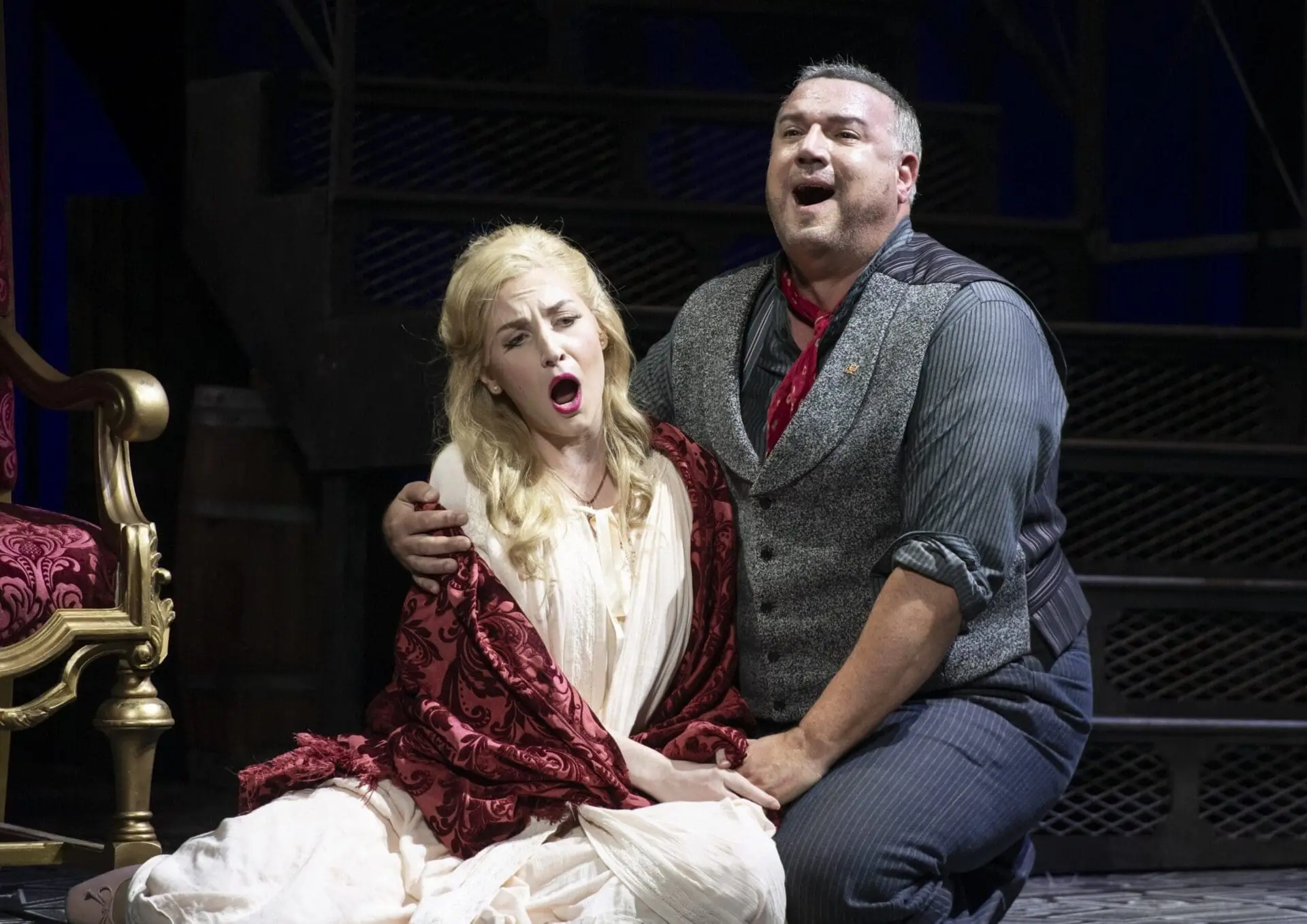 Still the London’s gentlemen’s club worked well and even made me think of Prince Andrew for a moment. The sumptuous set featured a larger-than-life portrait of Queen Victoria, which when lowered revealed a painting of an orgy, a neat visual cue to the hypocrisy and secret indulgences of the elite of that era (and the current). And the emergence of the club’s denizens in black cloaks and eerie white face masks recalled Kubrick’s Eyes Wide Shut. The foggy riverside scenes on the Thames, where hired assassin Sparafucile (well played by Nathan Berg) and his prostitute sister Maddalena ply their trade are evocative in a Jack the Ripperish sort of way.