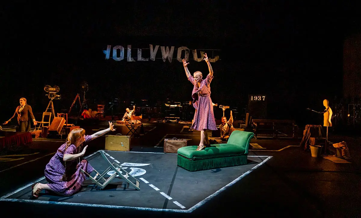 Choreographer Gary Clarke’s stage direction is imaginative and intelligent. In a Zoom chat posted to Opera North’s website, Clarke admitted that he’d been influenced by Lars von Trier’s 2003 avant-garde film, Dogville. So, similar to Trier, Clarke has the twins move around to different areas of the stage marked off by white lines. Designer George Johnson-Leigh anchors each of these “sin boxes” with a stationary installation such as a park bench, a cabaret table and stage, a movie camera, and so on. The iconic Hollywood Sign umbrellas the set from above. Lighting designer Mike Lock illuminates the twins’ journey from box to box, or city to city, as well as the family’s murky movements in the “no man’s land” between the boxes. Wanting to give the family more of a historical reference, Clarke portrays them as immigrants in mid-1930s America, paralleling the lives of Weill and Brecht. Stephen Rodwell’s costumes capably evoke that era.