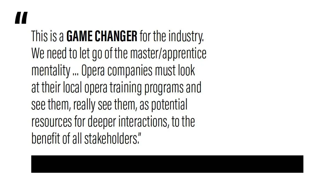 Interns reap the benefits of structured mentorship in administration and entrepreneurial skills by producers, conductors, directors and administrators who are problem solving and fundraising and marketing now. Interns work closely with both the professional cast and the production team, and this one-ups even the pros: currently, there is precious little interaction between cast and production team and these silos limit creative solutions and information exchange rather than fostering transparency and a shared sense of purpose.